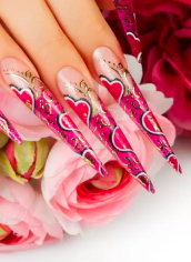 | Ombré Nails are a type of Acrylic in which a color gradient is created. A light color on the top of the nail gradually blends into a darker color toward the tip. | |